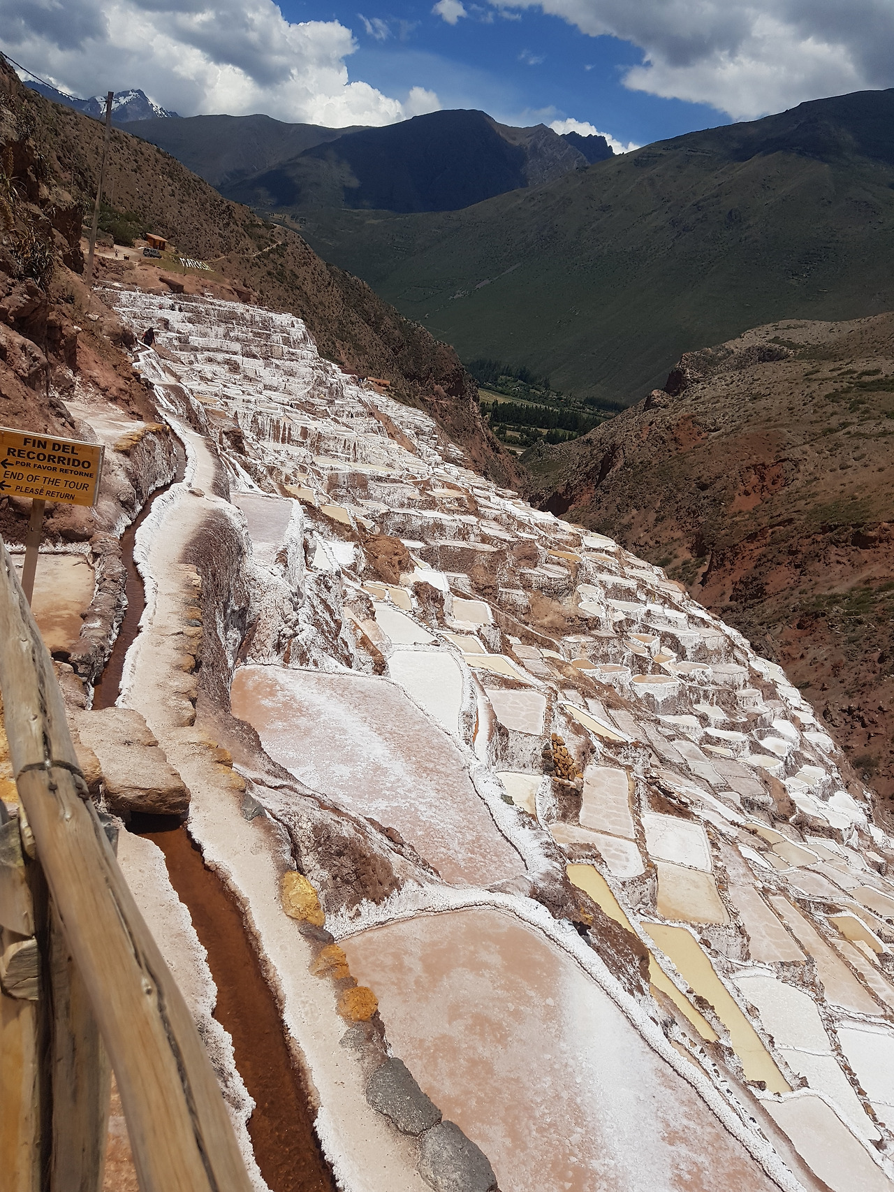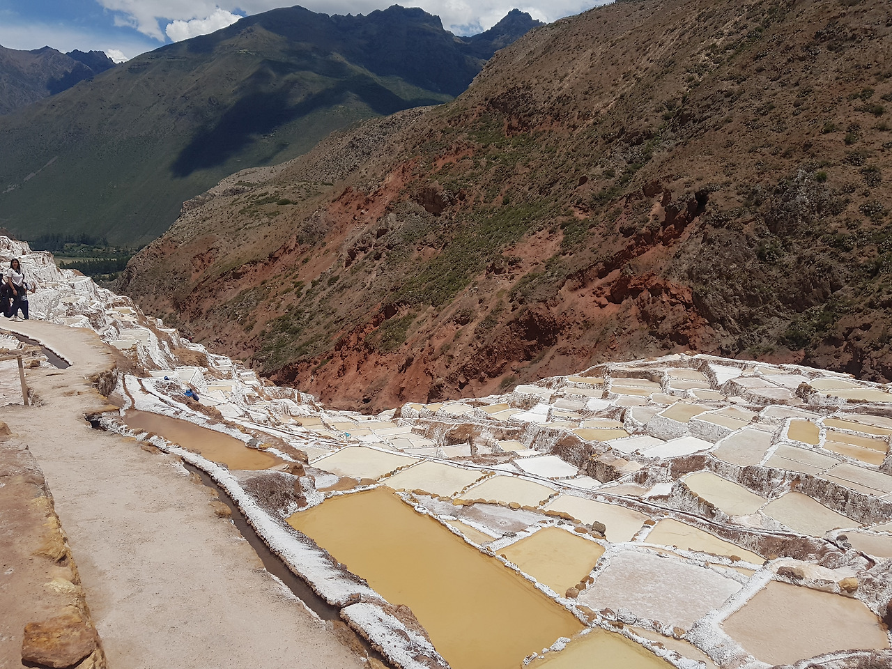 가볍게 친체로를 구경하고 다음은 소금 염전 살리네라스. 약 2천 년 전부터 자연적으로 소금을 얻어 내던 장소. 계단식으로 이루어진 소금 염전은 실제로 소금들이 나오고 있고 물도 흐르고 있었다.