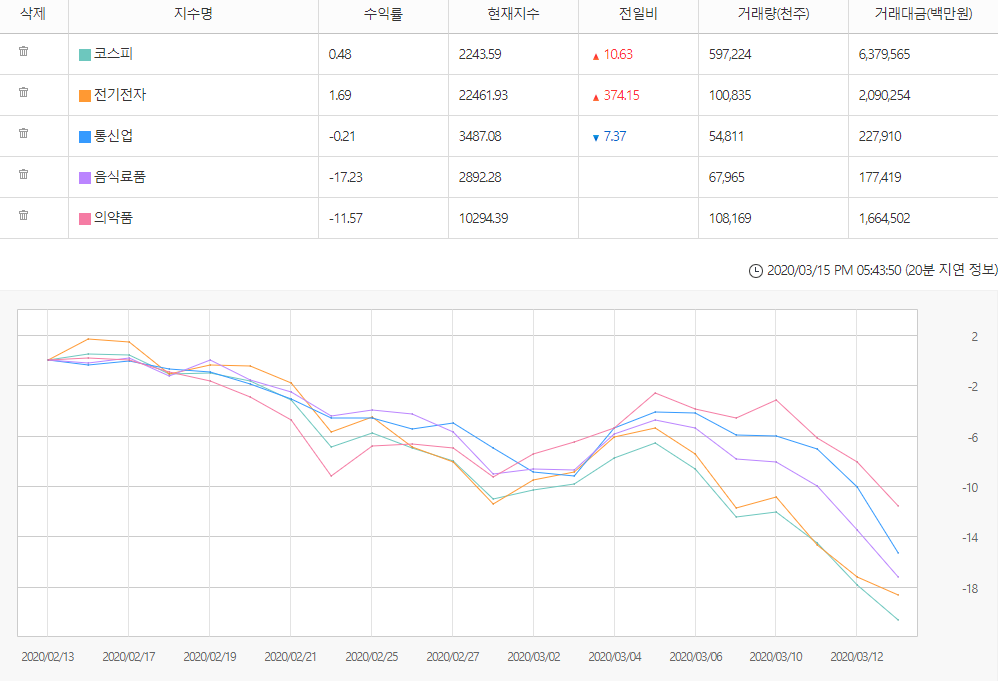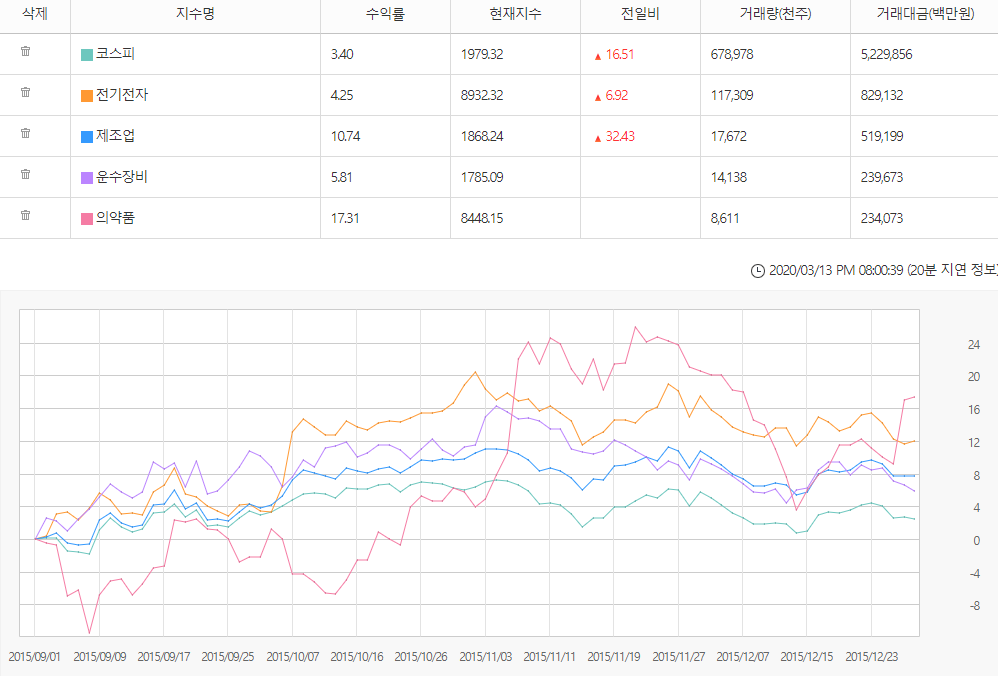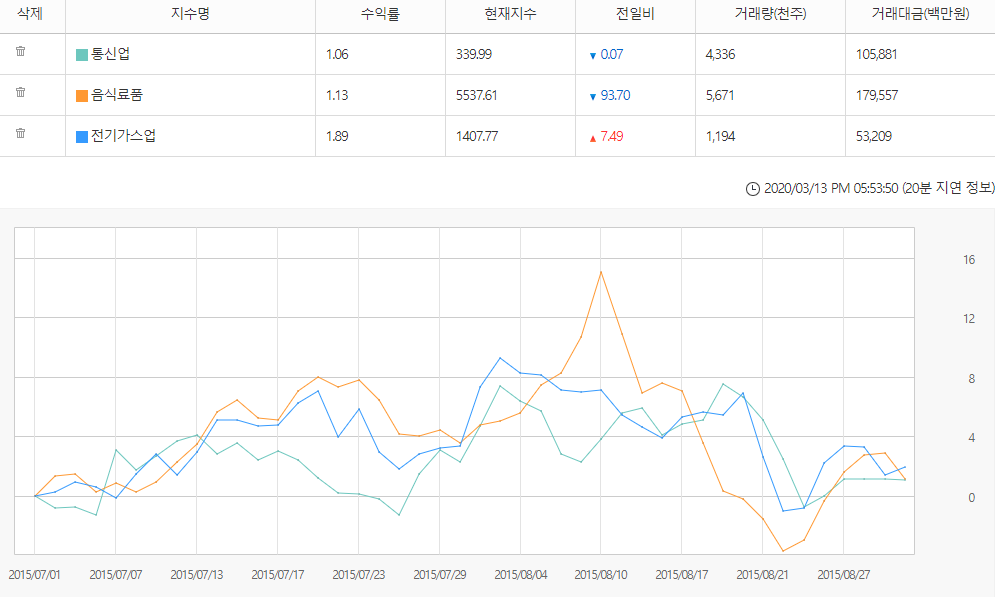 그때는 바로 2015.7.1 ~ 2015.9.1 구간으로, 엄청난 성장세에 있던 중국의 성장률에 의문을 품기 시작했던 구간입니다. 지금처럼 전염병, 또는 구체적인 문제가 아니고, 단기간에 불과했습니다. 하지만, 세계 및 국내 증시와 유가가 하락하여 경제적 흐름이 가장 유사했다고 판단했기에 이 구간을 분석했고, 그 당시 하락세에서 비교적 우수했던 3개의 산업군을 찾아봤습니다.