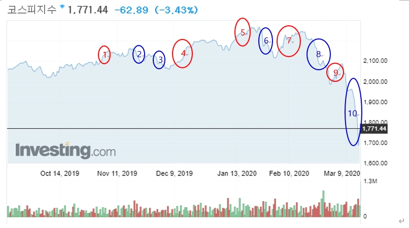 10) 하락: 미국 및 유럽 확진자 수 급증 / 국제 유가 30% 이상 급락 / WHO의 팬데믹 선언 / 미국-유럽 간 이동 중지 발표