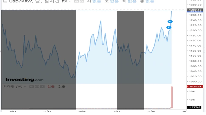 이번 차트는 환율입니다. 위의 유가 차트와 동일한 구간에 음영처리를 해봤습니다. 유가 급락과 동시에 환율 급등이 시작됐던 시기입니다. 그래서 이 구간들에 큰 폭으로 상승했던 한익스프레스를 분석해보고자 했습니다. 위험이 도사리는 증시로 인한 매출 감소를 상회할 만큼 저유가와 고환율이 상회할 수 있을지 알아봤습니다. 주가가 높았던 15년과 비교해보며 분석해봤습니다.