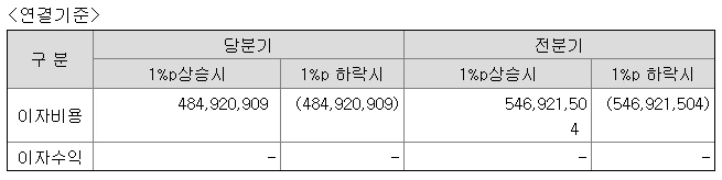 기업이 공시한 금리 변동에 따른 예상 실적 변동입니다. 금리를 인하한 만큼 이자비용에 대한 부담도 덜 것이고, 거의 연간 2억 5천만 원가량의 이자비용이 줄어들 것으로 기대해볼 수 있습니다.