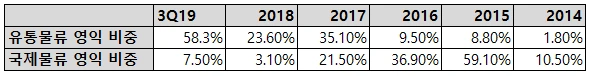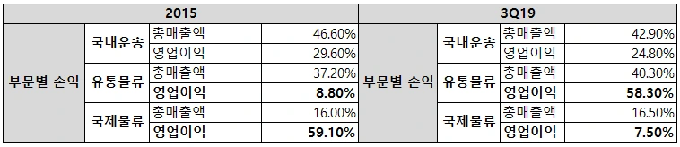 사업보고서를 읽으면서 흥미로운 부분을 찾아냈습니다. 창고 부문을 제외한 각 3개 사업부문의 매출액과 영업이익 비중입니다. 15년에는 국제물류 부문이 매출에서 16%를 차지했으나, 영업이익은 59.1%나 차지했습니다. 19년에는 매출액 비중이 크게 변하지 않지만 영업이익 비중이 7.5%로 떨어지고, 반대로 유통물류의 영업이익 비중이 크게 늘었습니다.