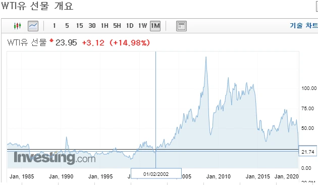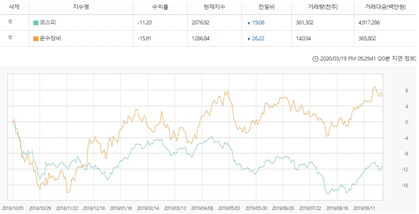 현재 유가는 21.74(20/3/19 9:53 기준 20.37)로 2002년 2월 이후로 가장 낮은 수준을 기록하고 있습니다. 2002년 이후로는 75 이상을 유지했던 구간이 거의 절반 가까이 차지하고 있는데, 현재는 그 수준에서 무려 1/3에 가까운 수치를 기록하고 있습니다. 저유가에 대해 수혜를 받는 기업으로는 대표적으로 항공, 해운, 육상운송과 같은 운수장비업과 석유를 원재료로 삼는 타이어, 전력, 화학, 페인트 등의 제조업종이 있습니다. 반대로, S-Oil과 SK이노베이션과 같이 석유를 유통, 정유, 또는 판매하는 기업은 악재로 작용할 것입니다.