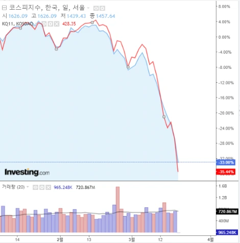 3월 19일 기준으로, 2300pt에 갈 것이라 기대했던 KOSPI는 1457.64pt로, 700pt에 갈 것이라 기대했던 KOSDAQ은 428.35pt로 떨어졌습니다. 불과 2달 만에 말이죠. 국내 증시가 이렇게 급락했던 적은 바로 햇수로 약 12년 전, 글로벌 경제위기라고 불렸던 리먼 브라더스 사태 때가 가장 최근이라고 할 수 있겠네요.