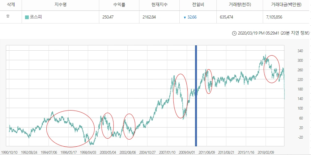 1990년부터 30년 동안의 KOSPI 추이입니다. 눈에 띄는 급락은 붉은 원으로 표시를 해놨듯이 총 6번이 있었습니다. 급락 후에는 반등이 분명 있었습니다. 하지만 푸른 직선(약 2010년)을 기준으로 이후 급락한 2개의 구간을 보면 급등이라고 하기엔 아쉬울 정도의 상승을 보여주고만 있습니다. 심지어 2018년 IT버블 이후에는 고점이었던 2600pt는커녕, 2300pt도 못 기록한 채 다시 급락하는 모습을 보이고 있습니다.