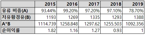 2015년부터 유류의 비중과 저유황경유의 가격입니다. 유류 비중과 공시된 저유황경유의 값을 곱해봤습니다. 이는 정말 완벽한 반비례는 보이지 않지만, 비중과 다른 여건을 고려하다면 어느 정도 반비례 관계있음을 알 수 습니다. 즉, 유가가 내려간다면 순이익에 영향을 미칠 것이기에 유가가 폭락했던 1Q20에는 매출원가가 비교적 하락하고 순이익률이 높아질 것으로 기대됩니다.