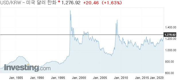 현재 원화 기준 환율은 무려 1270원으로, 이보다 높았던 적은 과거 40년 동안 IMF, 리먼 브라더스 사태를 포함해도 단 3구간 밖에 없습니다. 다들 알다시피, 환율의 강세는 수출을 많이 하는 기업과 미국 순자산을 많이 보유한 기업에게는 똑같은 성과를 내도 더 높은 실적을 가져다줍니다. 통화스와프 체결 소식으로 3월 20일 기준 낮아졌긴 했으나, 1200원 이상 수준으로 확실히 높은 수치를 기록하고 있죠.