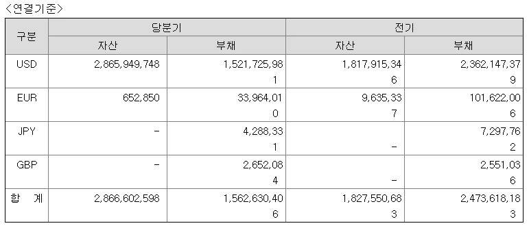 당사는 외화로 표시된 거래 역시 하고 있기 때문에, 외화로 표시된 화폐성자산 및 부채의 잔액 현황입니다. 현재 달러로 된 자산이 부채보다 많은 상황입니다. 회사 공시 기준 환율 10% 상승 시 134,422,377원의 자산 증가가, 10% 하락 시에는 -134,422,377원의 감소가 있을 것으로 예측했습니다. 이번 연도 초에 환율이 1150원 선이었던 점을 감안하면, 약 1억 가량의 안전한 창출을 기대해볼 수도 있겠군요.