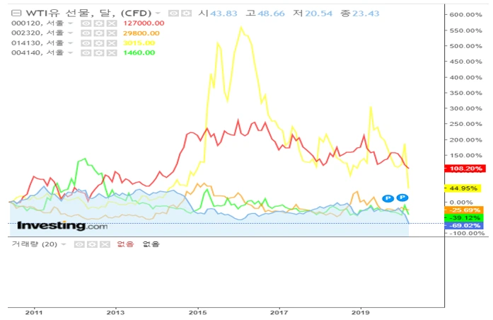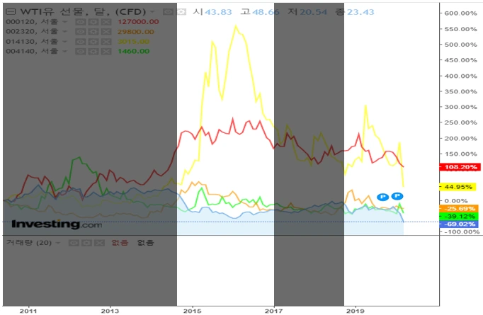음영 처리된 부분 외의 구간은 유가가 급락한 구간입니다. 그때 대부분의 기업의 주가가 오름세를 띄었고, 특히 한익스프레스와 CJ대한통운의 주가가 눈에 띕니다. 하지만, 2번째 구간에서는 비교적 CJ대한통운은 적게 올랐습니다.