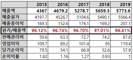 먼저, 기본적인 실적부터 봤습니다. 15년부터 19년 간 매출 등 주요 실적입니다. 보는 것과 같이 눈에 띄게 매출액에서 매출원가가 차지하는 비중이 큽니다. 비중 자체의 차이는 경미하지만, 그 비중과 순이익률이 완벽하게는 아니지만 어느 정도 관계가 있음을 알 수 있습니다.