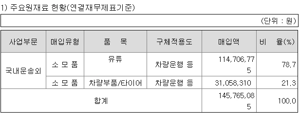 사업부문은 4개로 1) 국내운송(43.3%), 2) 유통물류(40.5%), 3) 국제물류(15.9%), 그리고 4) 창고(0.3%)입니다. 운송을 주 사업으로 하기 때문에 주요 원재료는 유류(경유)로 무려 78.7%를 차지하고 있습니다. 유가와 관련 있는 유류 매입액은 1억 1천만 원 수준으로, 이 바로 위의 도표가 단위가 억인 것을 감안하면 매출원가에서 1%도 안 되는 경미한 숫자입니다. 하지만 순이익률이 1% 수준인 점을 감안한다면, 순이익률과 맞먹는 수치이기에 급락하는 유가는 순이익에 꽤나 큰 영향을 미칠 것이라 생각합니다.