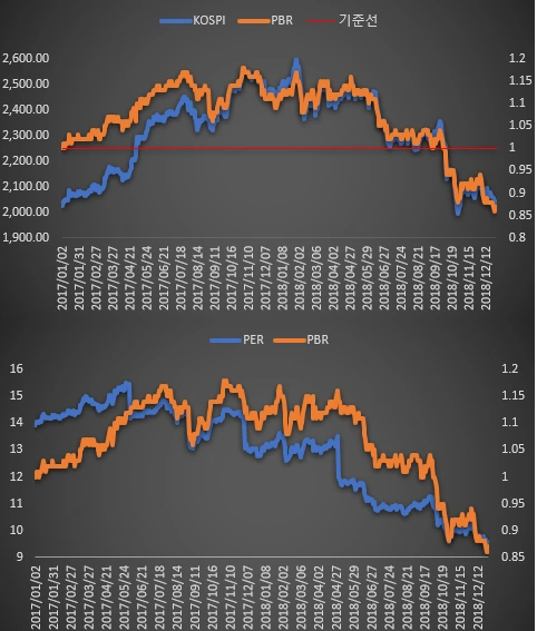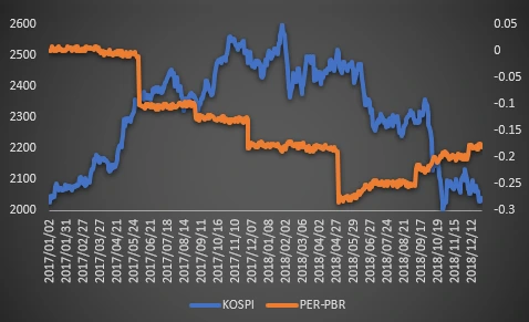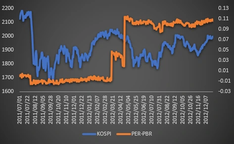 3) PER-PBR선의 급등락이 있고 약간의 시차 이후에 KOSPI 또한 급등락을 보입니다.