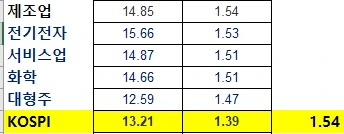 2008~2009년에서의 변동성과 상승 구간에서 KOSPI보다 우수한 성과를 기록했던 업종으로 왼쪽은 PER, 오른쪽은 PBR입니다. 해당 업종들은 KOSPI 평균 PBR 1.39보다 11% 높은 1.54 내에 존재했습니다.