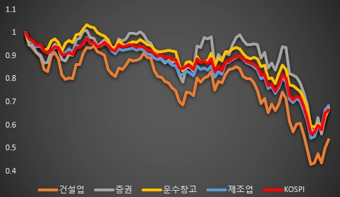이번에는 변동성 있던 구간입니다. 건설업종과 증권업종을 제외하고 유사한 성과를 기록하고 있습니다. 여기서 증권업 같은 경우에는 위에 언급했던 의약품과 같이 당시 수혜를 봤던 업종이라 할 수 있습니다. 이번 코로나로 인한 경기 침체 당시 제시했던 금리 인하, 증권시장안정펀드 등의 경기부양책을 제시했었고, 이에 증권업종은 수혜를 봤기 때문입니다. 이를 감안하고 증권업종을 제외한다면 KOSPI와 비슷하거나 저조한 성과를 보였다고 할 수 있겠네요.