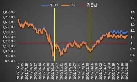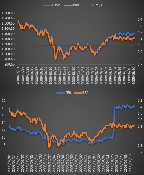 2008년 당시의 그래프입니다. 글 중간에 말했던 하락 구간인 2008년 10월 31일까지는 PER과 PBR의 간격이 줄어들고 있습니다. 그리고 2009년 2월 말까지 변동성을 띄는 구간에는 간격이 좁혀진 채로 변동하는 모습을 보이고 있습니다. 그리고 상승 시기인 2009년 3월부터 PBR과 PER의 간격이 넓어지는 모습을 볼 수 있습니다.