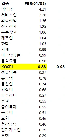 급락 전, 1월 2일 기준 업종별 PBR입니다. 아쉽게도 KOSPI의 PBR은 0.88 수준으로 11% 내에 있는 업종은 음식료품 밖에 존재하지 않았습니다.