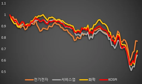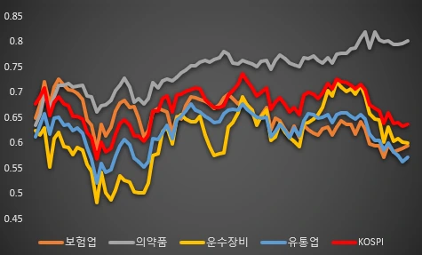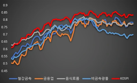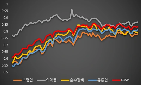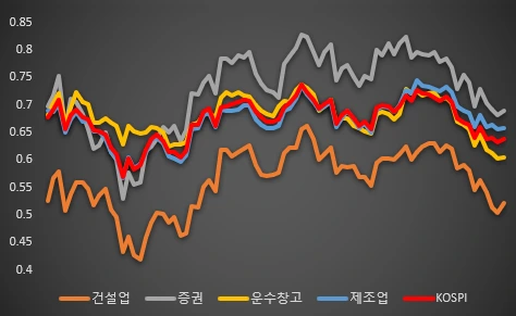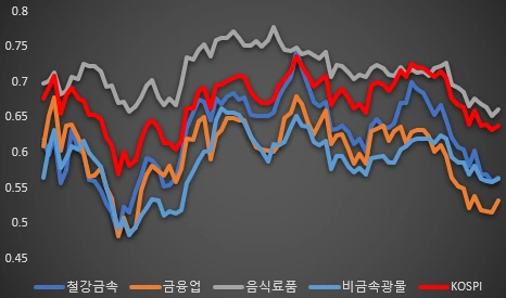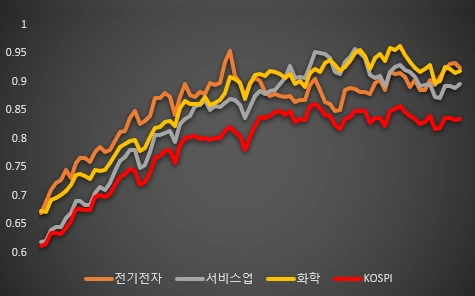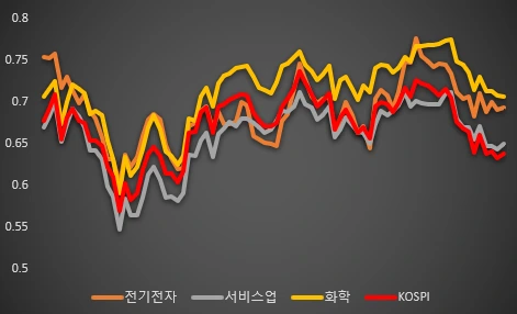 이번에는 변동성 구간입니다. 변동성 구간에서 서비스업을 제외한 두 업종은 KOSPI보다 확실히 높은 수익률을 보이고 있습니다. 심지어 서비스업 역시 KOSPI와 유사한 수치를 기록하다가 마지막에는 소폭이지만 KOSPI를 상회하는 모습을 보이고 있습니다.