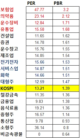 으로 나눠봤습니다. 그리고 시가총액이 너무 낮지 않은 업종들에 한해 KOSPI 평균 PBR을 기준으로 분석해봤습니다.