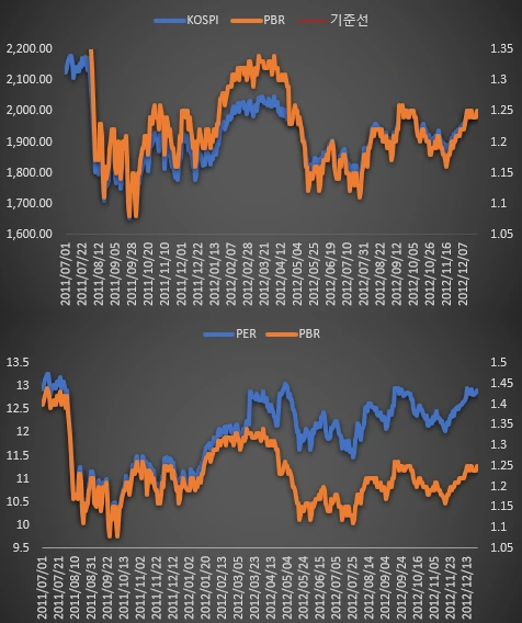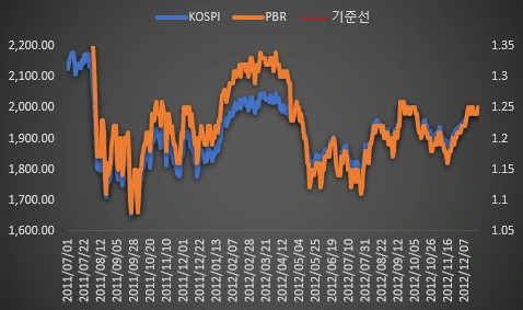 이 구간은 2011년 8월, 미국의 더블딥 및 신용등급 하락 우려로 인해 KOSPI가 급락했었을 때입니다. 이 때는 PBR이 1보다 항상 높은 수준이었습니다. 그리고 회복하기 시작한 2012년 7월 말에도 PBR은 높은 수준을 유지하고 있었습니다. PBR이 1보다 높다고 해서 상승여력이 없다는 것은 아니죠.