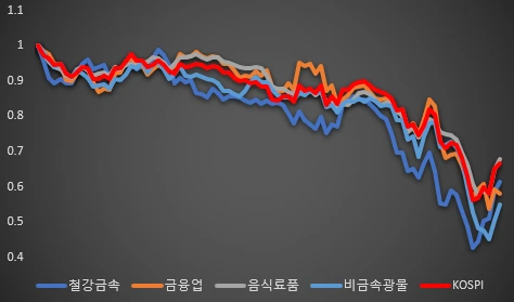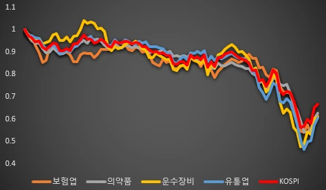 변동성 구간에서 분명 특별한 모습을 보이고 있지만, 기대했던 모습과 반대입니다. 음식료품을 제외한 업종들은 위에 언급한 다른 업종들에 비해 KOSPI보다 큰 폭으로 하락했습니다. 중간 지점에서 괜찮은 성과를 보였던 음식료품은 끝자락에서 KOSPI와 크게 다를 게 없는 수치를 보이며 결국 저조한 모습을 보이고 있습니다. 그렇다면 회복 구간에는 달라진 모습을 보일까요?