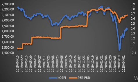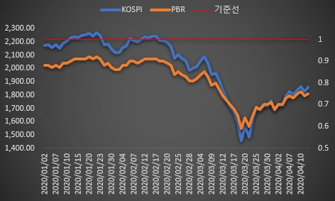 최근 KOSPI는 다른 나라 증시에 비해 굉장한 상승률을 보이면서 불과 몇 주전까지만 해도 1400pt 수준이었다는 것이 무색하게 현재는 1800pt 중반을 기록하는 중입니다. 다른 나라에 비해 상대적으로 많이 상승했고, 코로나 확산 위험이 아직 해소되지 않은 시점 고평가 되지 않았을까 생각했습니다. 하지만, 현재 PBR이 기준점 1보다 많이 낮은 0.7~0.8 수준이기 때문에 저평가됐으며, 상승 여력이 충분하다는 의견도 있는데요.