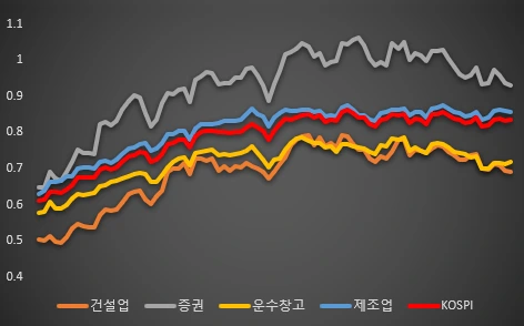 마지막으로 회복 구간입니다. 역시나 증권업을 제외하고 특별해 보이는 업종은 없습니다. 제조업은 KOSPI보다 높은 상승을 보이고 있지만 폭이 크진 않고, 나머지 두 업종은 많이 저조한 모습을 보이고 있습니다. 이번 그룹을 통해서도 높은 PBR은 상승 매력이 비교적 덜하다는 사실을 더 확실하게 알 수 있었습니다.