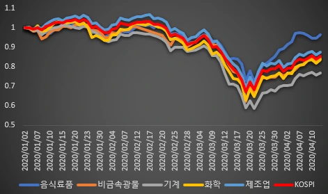 코로나로 인한 급락 전, 1월부터 4월 14일까지 음식료품 업종을 포함한 KOSPI 평균에 비해 PBR이 약간 높은 4개 업종을 비교했습니다. 과거 PBR 11% 요건에 충족한 1) 음식료 업종은 뛰어난 성과를 기록하고 있으며, 2) 제조업, 3) 화학, 그리고 4) 비금속광물은 KOSPI와 비슷한 성과를 보이고 있습니다. 5) 기계업종은 다소 부진한 모습을 보이고 있습니다. 하지만, 아직 근본적인 문제가 해결되지 않은 상황이기에 변동성 구간이 끝나지 않은 점에서 충분히 더 상승 여력이 있기에 오히려 저평가 매력이 있다고 생각합니다.