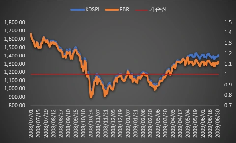 먼저, 제 글에서 가장 많은 예시로 들었던 리먼 브라더스 사건 당시이며 2008년 7월부터 1년 동안의 그래프입니다. 당시 PBR의 최저점은 0.7과 0.8 사이로 현재와 유사한 수치입니다. PBR의 첫 저점이었던 2008년 10월 구간을 보면, 분명 다시 반등을 하지만 1달 후 다시 전 저점 수준으로 복구됩니다. 또한 2009년 2월에 다시 크게 하락하는 것을 볼 수 있습니다.