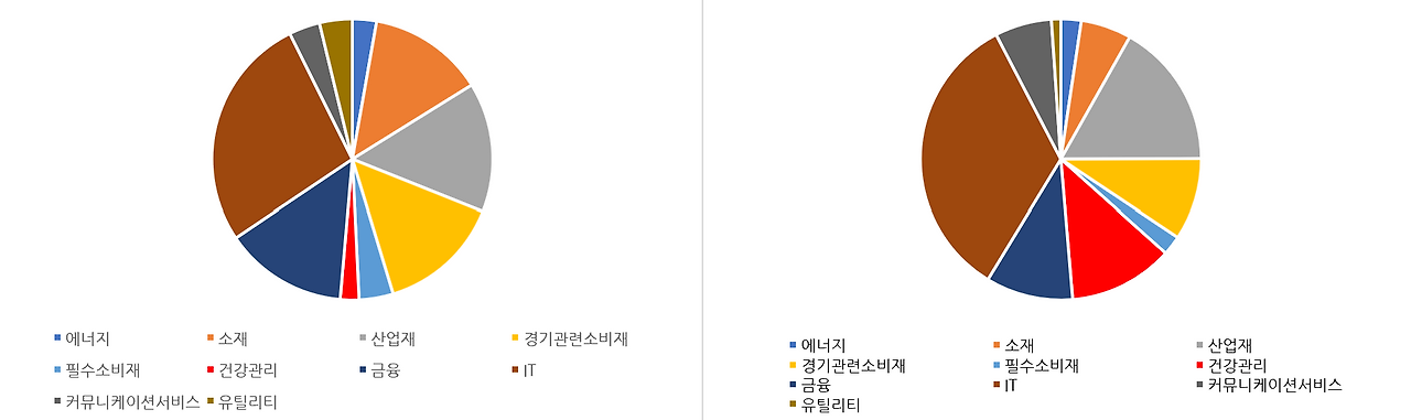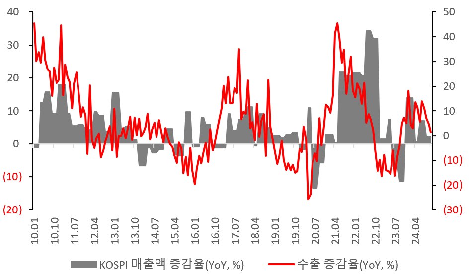 위의 차트는 KOSPI의 매출액 증감률과 수출 증감률을 보여준다. 우리나라가 수출의존도가 높은 만큼, 수출에 따른 매출 변동이 큰 것으로 보인다. 최근 들어 수출을 보면 증가하고 있긴 하지만, 그 폭이 계속해서 떨어지는 모습을 보이고 있다. 그럼에도 과거에 증감률이 (-)를 기록할 때가 많았던 것을 보면, 지금의 상황은 나아 보일 수 있다.