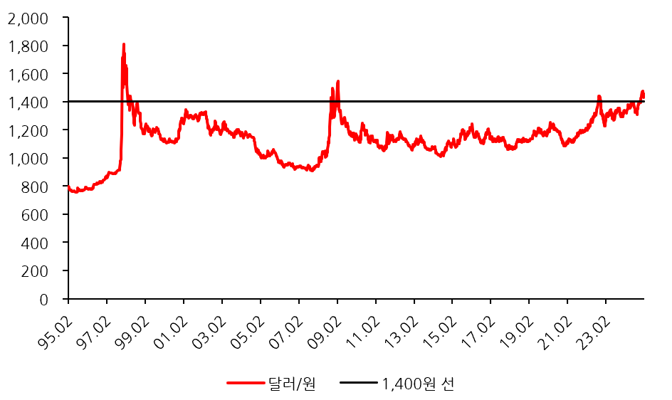 1995년부터 지금까지의 달러/원 추이를 그려보았다. 검은색 선은 1,400원으로 약 20년 간 1,400원을 넘었을 때는 1) IMF, 2) 서브프라임 모기지, 3) 코로나19, 그리고 현재다. 1) ~ 3) 구간은 모두가 아는 전 세계적으로 위기가 있던 구간이다. 그런 상황에서 대표적인 안전자산인 달러가 오르는 것은 당연한 일이다. 대부분의 경제는 수요와 공급의 법칙에 따라 가격이 형성되고, 위기의 상황에서는 안전자산인 달러의 수요가 늘어난다. 그렇다면 지금은 앞서 말한 전 세계적으로 위기가 있던 구간인가? 그렇다기에는 너무나 평화롭다. 최근 달러/원 환율이 오르게 된 큰 배경으로는 1) 트럼프 대통령의 당선과 2) 비상계엄 사태가 있었다.