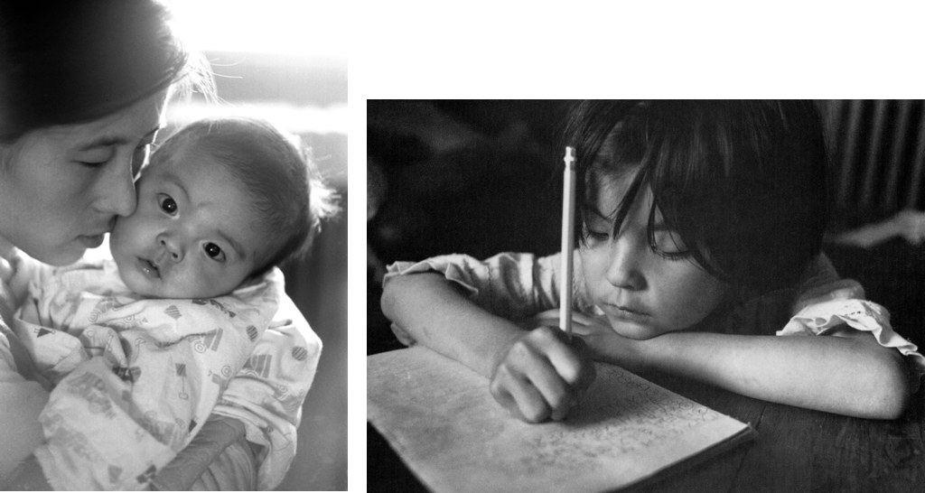 혹시 사진에 관심이 있으시다면, 선생이 두 가지 전술 중 어떤 것을 사용했을지 상상하며 보는 재미도 있을 것입니다. 어린 윤미가 잠든 모습을 몰래 찍은 사진이나, 멀찍이 떨어져 아이들의 노는 모습을 찍은 사진을 보면, 카메라가 그들을 방해하지 않도록 최대한 거리를 두고 고심한 흔적이 엿보입니다. 첫 번째 전술을 사용한 셈이지요. 또 어떤 사진들에는 윤미와 거울에 비친 선생 자신의 모습이 함께 프레임에 담겨 있기도 합니다. 카메라를 보며 천진하게 웃는 윤미의 표정과 카메라에 가려져 살짝만 보이는 선생의 표정은 정말 아름답습니다. 두 번째 전술의 성공적인 예입니다. 이렇게 <윤미네 집>에는 사진의 전과 후를 상상하게 하는 기분 좋은 순간들이 가득합니다.