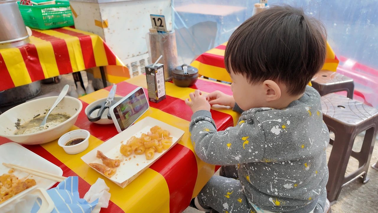 얼마만의 흥정이었는지! 사장님을 뚫어지게 쳐다보며 요란스레 입맛을 다시는 아이 덕에 우린 국수와 빈대떡, 그리고 튀김을 아주 저렴한 가격에 구매할 수 있었다. 들깨 가루가 듬뿍 들어간 국수를 물처럼 들이킬 때, 허겁지겁 오징어 튀김과 빈대떡을 집어먹던 아이의 손가락은 기름이 잔뜩 묻어 제 스스로 반질반질한 빛을 내비쳤다.