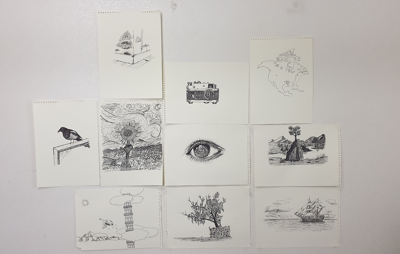 제가 주로 생활하는 공간은 책상 앞인데, 책상에서 보이는 벽지가... 딱 적당히 지저분합니다(?). 벽지를 새로 교체하거나 조각난 벽지로 덮을 정도는 아니지만... 그렇다고 그냥 보기에는 좋지 않은. 그래서 제가 직접 이곳에 '셀프 벽지 인테리어'를 해보기로 했습니다. 인테리어 재료 비용 2,000원에 인건비 0원. 기적의 셀프 인테리어가 시작되었습니다. 재료는 다이소에서 구매한 1,000원짜리 스케치북과 1,000원짜리 만년필. 그리고 잉여시간이 넘쳐흐르는 저의 오른손을 무상으로 빌려왔습니다. 이 획기적인 프로젝트에 제 게으름이 합류하는 바람에.. 벽 한쪽을 덮을 정도로 그림을 붙일 때까지 꽤 오랜 시간이 필요했습니다.