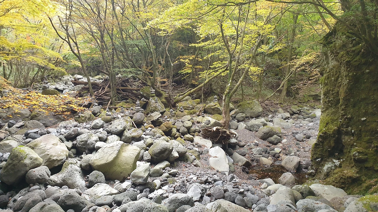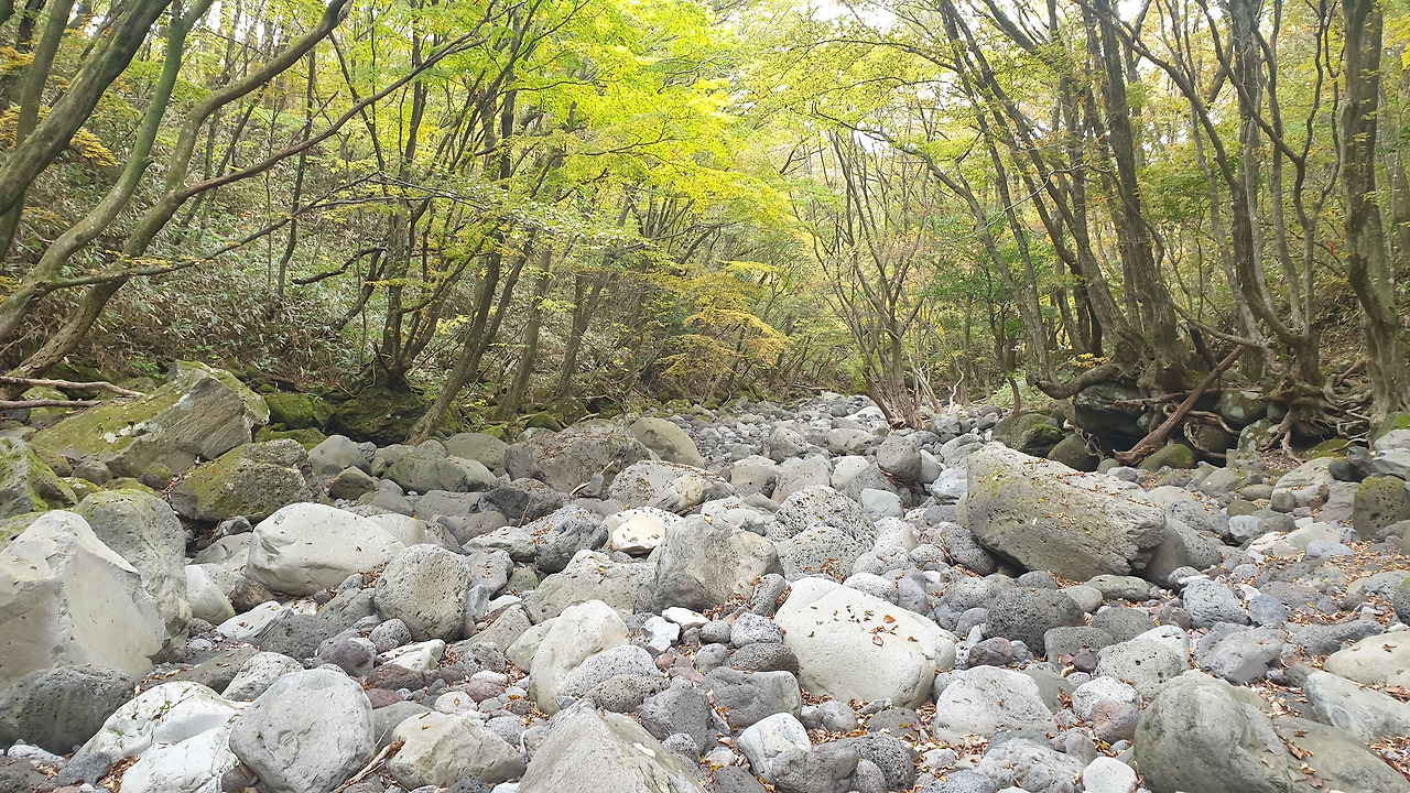 제주도에 있는 대부분의 계곡은 '건천(乾川)'입니다. 비가 내릴 때는 물이 흐르다 비가 그치면 물이 흐르지 않는. 한라산에서는 종종 하룻밤 사이 1000ml에 가까운 비가 쏟아질 때가 있다고 합니다. 건천은 제주의 지붕에서 흘러내리는 물을 바다로, 땅 밑으로 실어내는 역할을 합니다. 자연 배수로라고 생각하시면 좋을 것 같네요. 이런 사실을 알 턱이 없는 외지인인 저는 '계곡을 따라 이어진 등산로이니 만큼, 물은 걱정할 필요가 없겠구나'라는 헛된, 그리고 달콤한 꿈을 꿀 수 있었던 거죠.