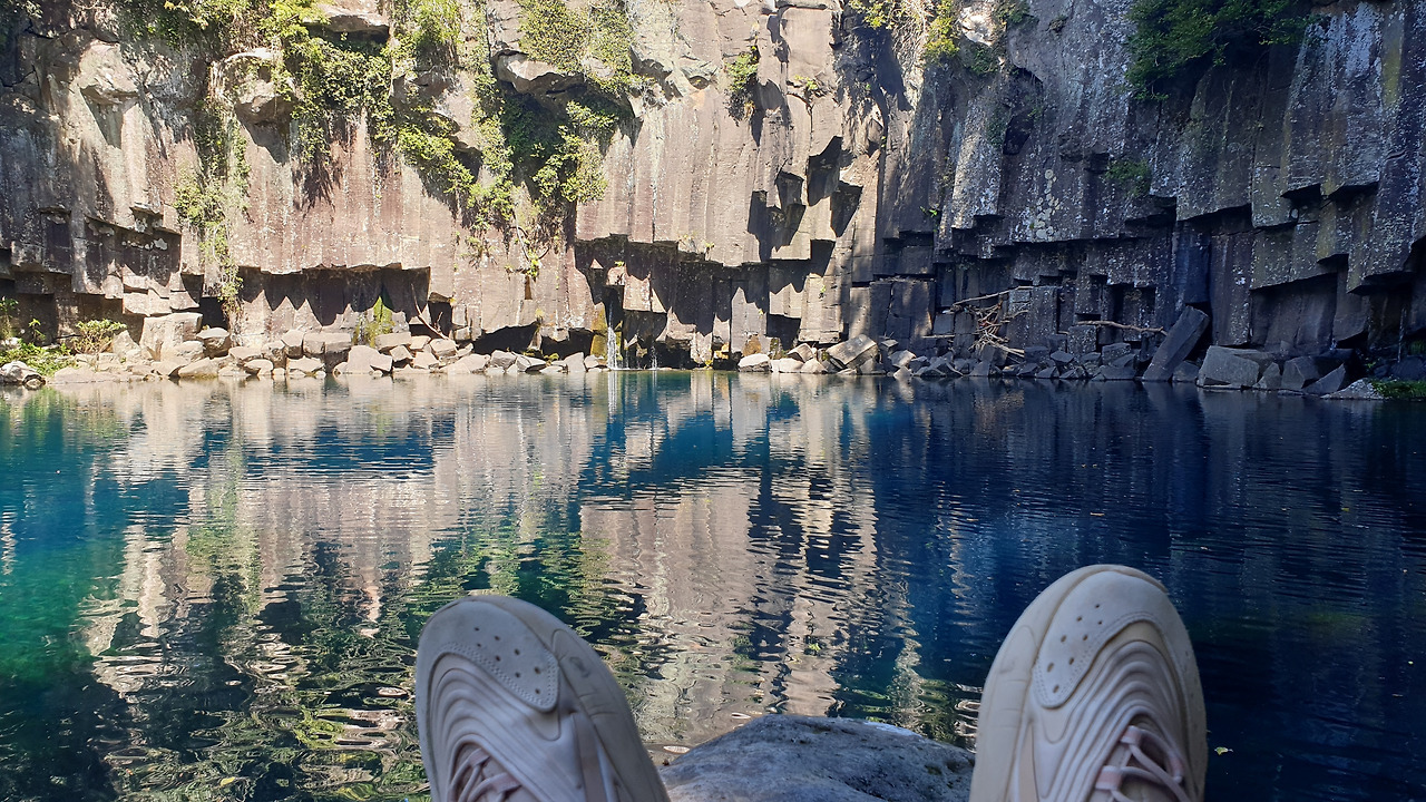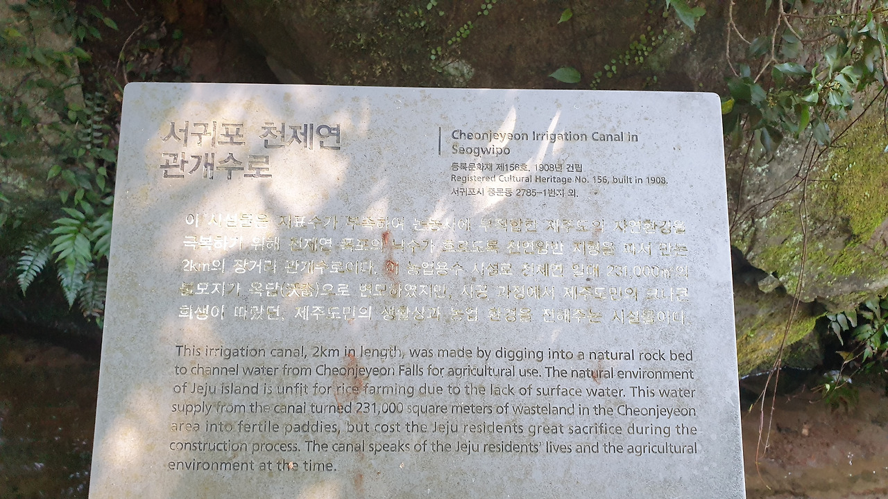 지질의 특성상 밭농사가 주를 이루었던 제주도에도 소수의 농경지가 있었습니다. 그중에 한 곳이 바로 천제연 폭포 인근에 있습니. 암벽과 암벽 사이를 가로지르는 좁은 물길. 불을 피우고 술을 부어가며 돌을 깨부수고, 강점기 시절에는 화약을 바위에 둘러 폭파를 시켰다고 합니다. 물이 풍부했던 다른 농경지와 비교해 보았을 때, 천제연 수로는 인위적으로 자연을 개척하고자 했던 독특한 사례입니다. 그만큼 제주에선 쌀이 귀하고 값비싼 곡물이었다고 합니다. 도외 지역에서 값싼 쌀이 들어오기 시작하면서 대부분의 논이 폐답 되었습니다. 수로의 물은 여전히 힘차게 흐르고 있습니다.