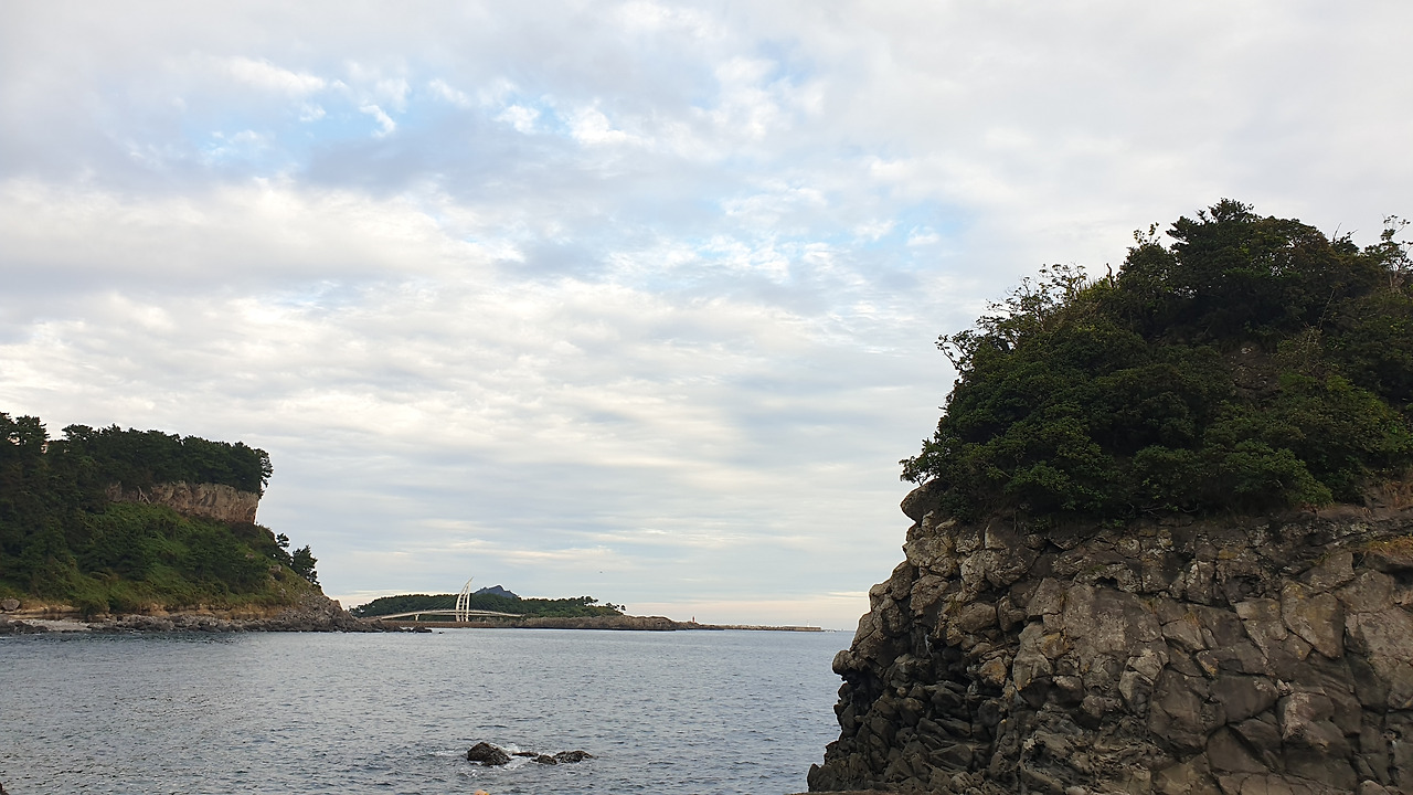 도민, 관광객, 외국인, 일본군, 북한군, 수학여행을 온 학생들까지... 선녀 빼고 모두가 찾아오는 선녀 없는 선녀탕은 저마다 다른 목적을 가진 인간들이 스쳐 지나갔던 시대의 교차점이었습니다. 태평양 전쟁이 끝나자 냉전이 찾아오고, 전쟁이 사라진 장소에는 다시 고무 튜브를 허리에 두른 아이들이 찾아옵니다. 저기 멀리 가녀린 전통배, 테우를 모티브로 세운 새연교가 보입니다.
