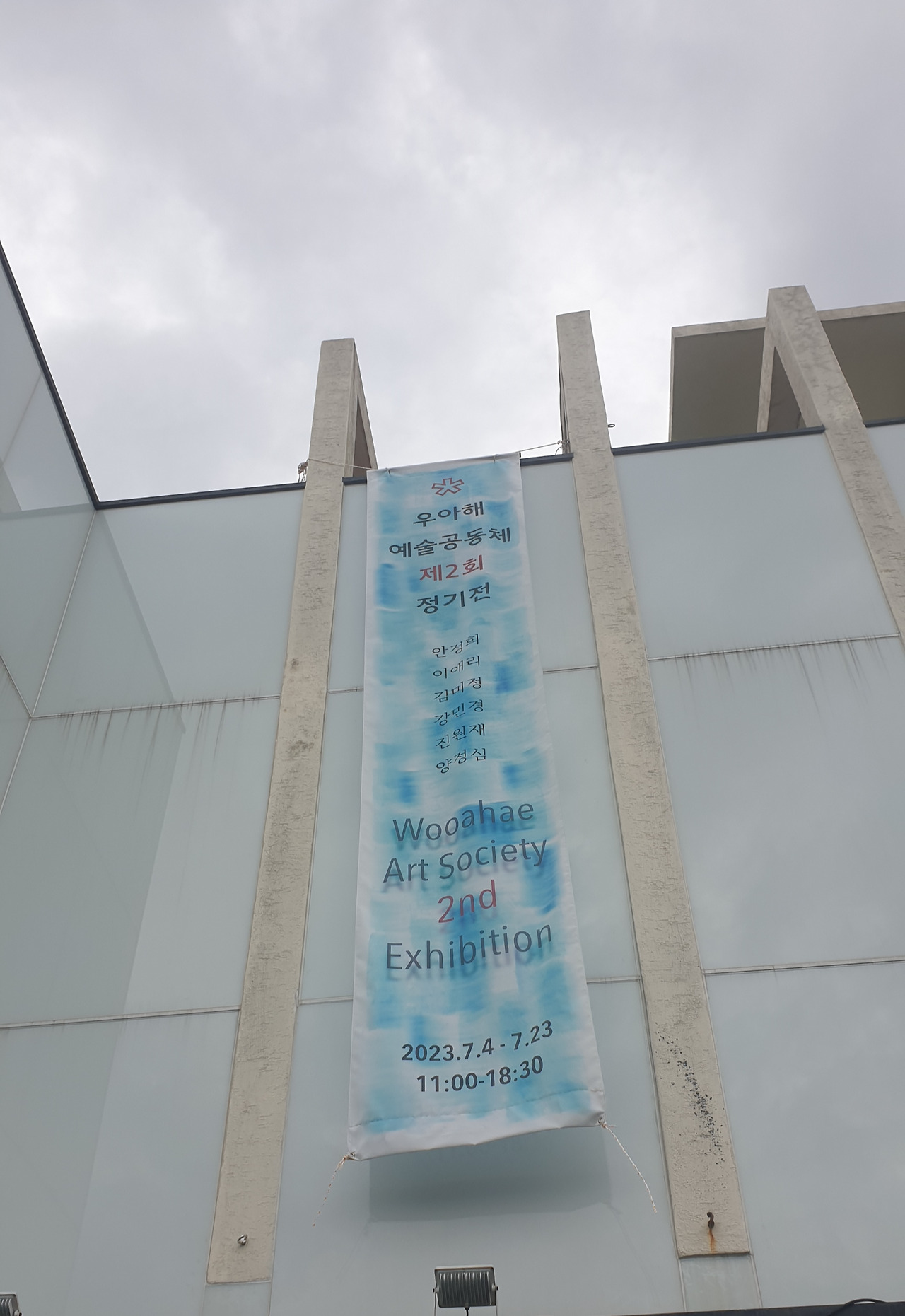 얼추 그림의 위치를 정하면 이제 수평을 맞춰야 한다. 침침한 눈을 이리저리 흘깃대며 작품을 이리저리 흔들어놓았다. 기가 막히게 수평을 잡지 못하는 나는 '난시 작가'라는 별명이 생겼다(젊은 놈이 벌써...). 작가님들의 훈수와 감독 아래에서 마침내 그림을 모두 걸었다. 이제 시를 벽에 붙일 차례다! 시원한 에어컨 바람이 무색하게 이마에는 송글 송글 땀이 맺혔다. 작품이 전체적으로 우측으로 몰린 것 같았다. 절망! 아메리카노에서 단맛이 느껴졌다. 머리가 지끈거릴 땐 몸을 괴롭힐 필요가 있다. 30도 무더위 속에서 낑낑대며 현수막을 설치하다 보니 다시 생각이 바뀌었다.