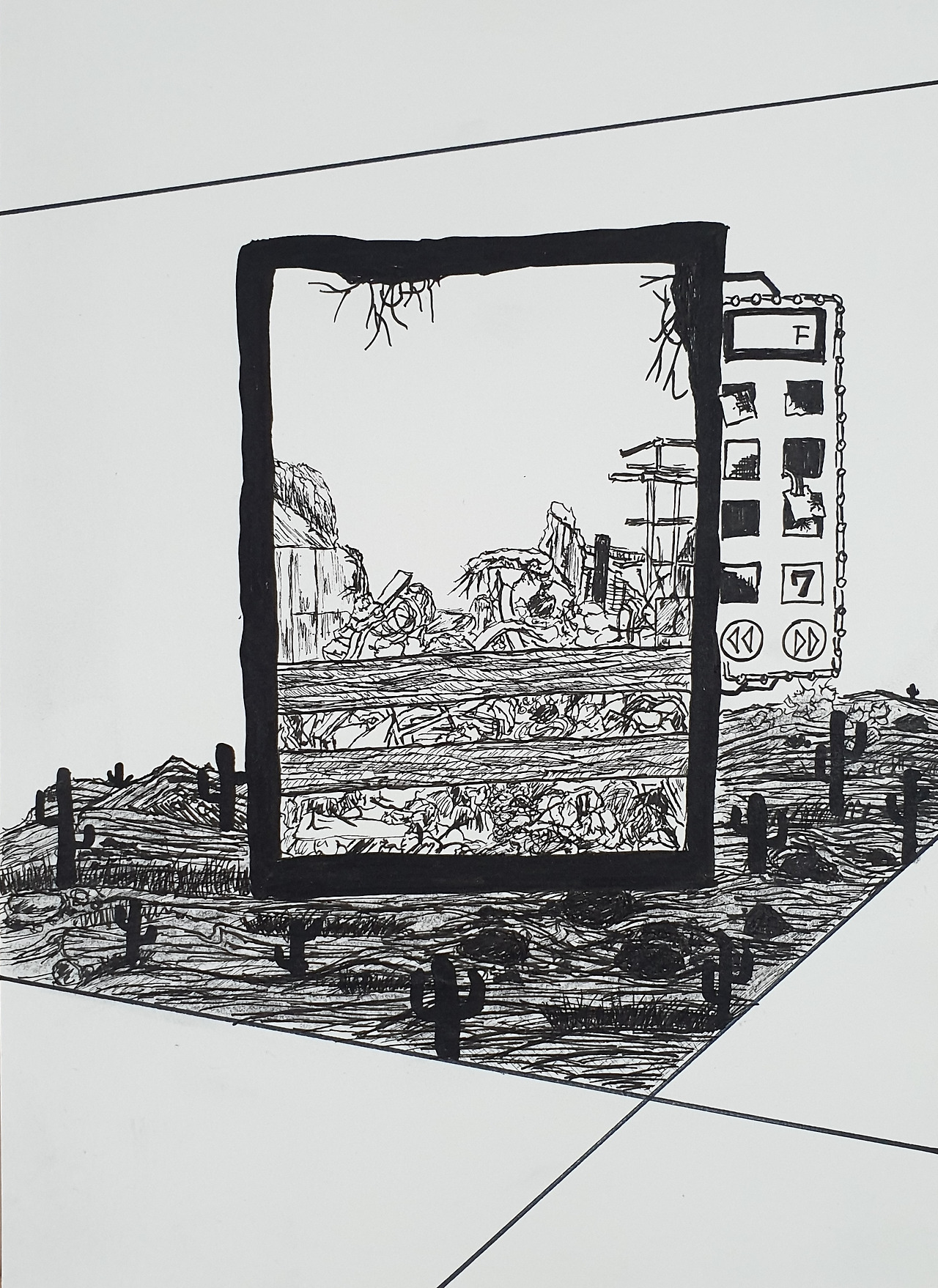상처에 새살이 돋아나듯이 제주도는 급격한 성장과 진통을 겪고 있다. 이념의 손가락질 속에서 선인장의 열매를 팔아 살아남은, 여전히 '4'를 외면하고 두려워하는 섬사람들. 1970년을 기점으로 세워진 신도시의 건물들이 하나씩 무너지며 도시가 허물을 벗기 시작한다. 제주의 대문 정낭은 이제 관광지의 소품이 되었고 도어록과 엘리베이터가 새로운 출입구가 되었다. 멸시와 핍박이 가라앉지 않던 섬은 전 국민이 사랑하는 사계절 여행지가 되었다. 뒤집어보면 상처가 없는 곳이 없는 섬, 고층 빌딩이 올라서고 엘리베이터 회사가 군침을 흘리는 블루오션. 정낭 너머로 보이는 시멘트벽과 초특가 분양을 알리는 플래카드. 차로 꽉 막힌 도로와 사라진 인도, 어디에서도 자동차의 위협과 공사장의 소음을 피할 수 없는 매일매일이 새롭고 낯선 도시. 제주도의 차가운 중심부만큼 흑백 그림이 잘 어울리는 곳은 한동안 찾기 힘들 것 같다.