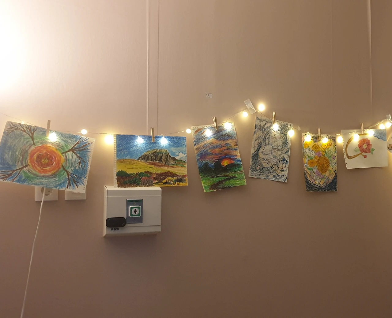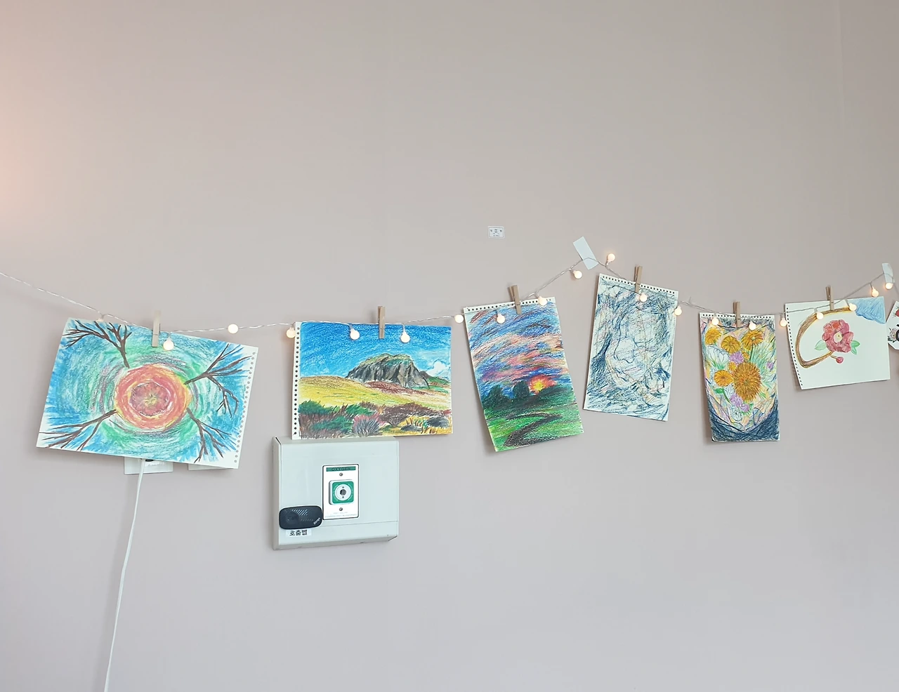 내일은 초음파로만 보던 아이를 처음으로 만나는 날이 될 것이다. 불안한 마음으로 떨리는 손을 겨우 부여잡고 서둘러 짐을 챙겨 병원으로 출발했다. 직원에게 안내받은 가족 분만실은 두 사람이 머물기에는 지나치게 넓고 추웠다. 커다란 욕조, 환자용 침대, 암막커튼과 몇 가지 의료장비. 우리는 진통이 더 심해지기 전에 서둘러 전시 준비를 끝마치기로 했다. 미리 준비한 줄과 그림을 산소 공급기가 박힌 하얀 벽에 걸었다. 새끼줄에 고추와 숯을 꼬듯이 아이의 모습과 울음을 상상하며 그림에 함께 엮었다. 아, 물론 갓 태어난 아이는 시력이 나빠 우리가 준비한 그림을 전혀 볼 수 없을 것이다. 어느 정도 머리가 크면 남겨진 사진을 통해 우리의 시작점을 만날 수 있지 않을까. 단 한 명의 고객을 위한 전시회. 그의 피드백을 받기 위해선 수년을 참고 기다려야 한다.