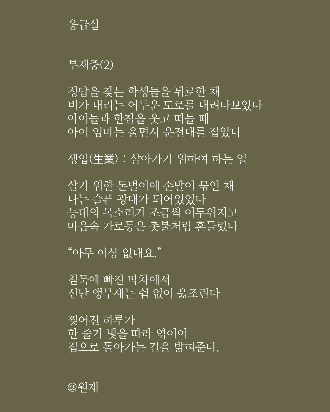 몇 년 전, 대학병원 응급실에서 2주 동안 학생 실습을 했었다. 속싸개와 이불로 둘러싸인 아기를 들고 찾아오는 엄마 보호자들이 참 많았는데, 생사의 기로에 놓인 환자를 우선적으로 돌보다 보니 상대적으로 상태가 괜찮은 아기들은 진료 순서가 뒤로 밀리는 경우가 많았다. 아기 엄마는 되도록 아기를 침대에 내려놓지 않으려고 했다. 혹여나 아이를 영영 놓쳐버릴까 봐 그랬을까? 커튼 너머에선 인기척 하나 느껴지지 않았다. 가끔 울음소리와 통화하는 소리가 들렸다.