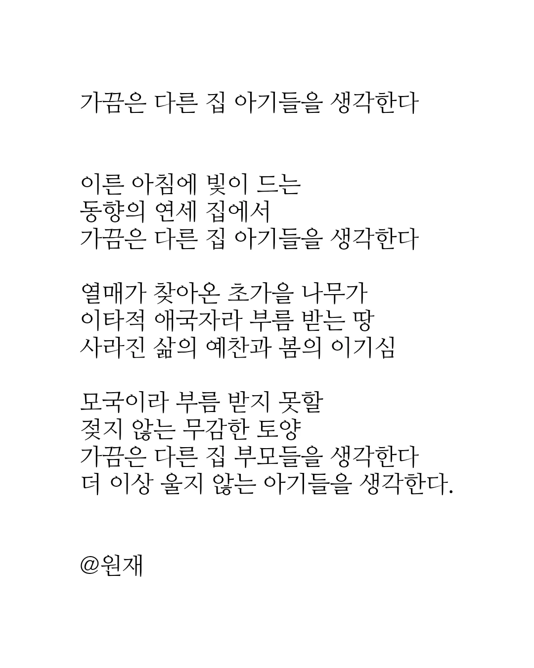 부모가 된 이후에 애국자, 이타적인 사람이라는 이야기를 주변에서 종종 듣고 있다. 자신의 유전자를 후대에 전달하고자 하는 욕망이 사라진 시대에서 부모는 출산과 동시에 이타적인 애국자라 부름 받는다. 이상한 세상이다. 햇빛과 수분과 양분을 독식하는 이기심의 결과물일지도 모르는데. 우리는 출산율을 잃어버린 것이 아니라 삶에 대한 투쟁과 경외심을 잠시 망각한 것일지도 모르겠다. 이제는 우리의 대지가 어떠한 물기도 머금지 못하는 야박한 절벽이라고 느껴진다.