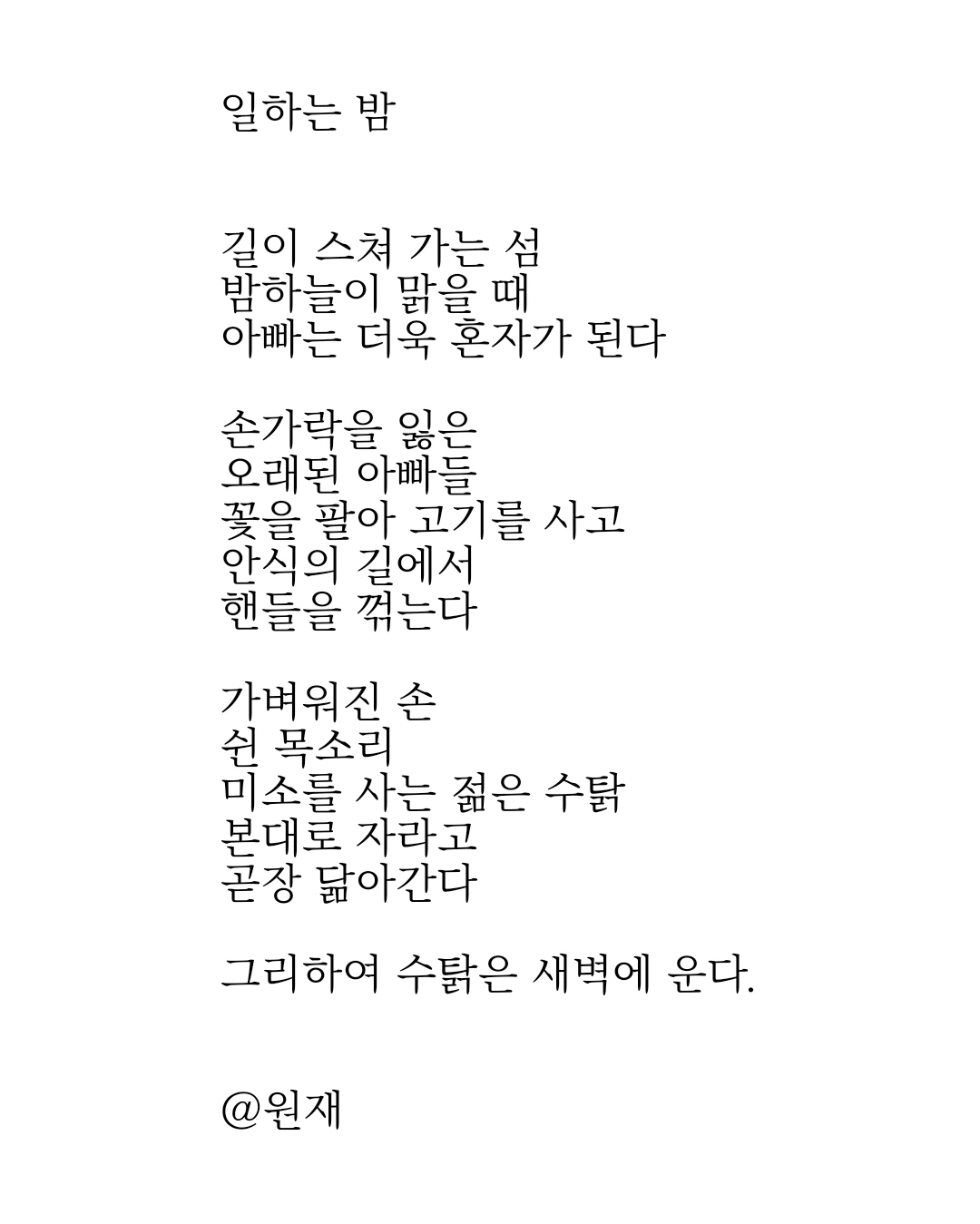 집 근처의 꽃집에서 새로 들일 화초를 구경하다가 꽃집 아저씨에게 육아에 대한 일장 연설을 들었다(꽃을 팔 생각은 그다지 없어 보이셨다). 매일 고기를 사서 손주 집으로 퇴근한다는 아저씨의 약지는 한 마디 정도가 잘려 있었다. 아빠들은 가을 나무처럼 무언가 자꾸 잃어버린다. 겨울을 버틴 고목에서 무모하고 억센 아름다움이 느껴진다. 우리는 본 대로 자라고, 곧장 그들을 따라간다.