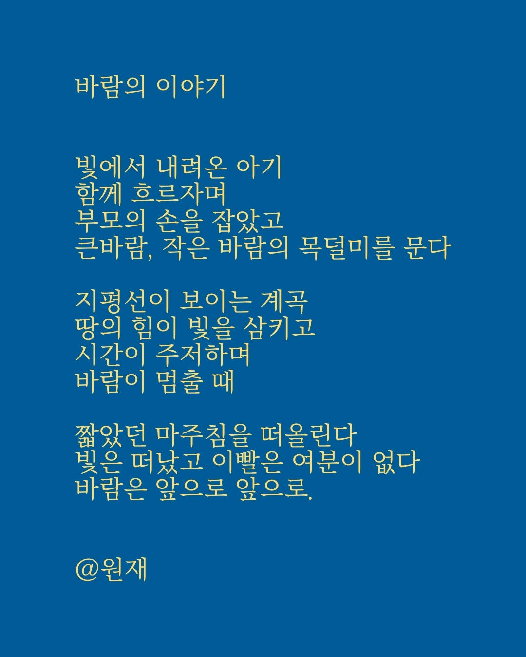 아기 엄마의 진통을 바라볼 때 시간이, 그리고 세상이 멈췄다고 생각했다. 그 길고 길었던 만남은 새로운 하루들이 쌓이자 한없이 짧아졌고 아기의 사서는 통통하게 살이 오르고 있다. 감정의 언어를 담을 서랍이 만들어지지 않은 아이는 즐거움과 슬픔의 극단을 쉴 새 없이 오간다. 반대로 어른은 너무나 많은 단어를 안고 살아간다. 실오라기의 떨림도 태풍으로 만드는 조바심의 언어는 도대체 어디에서 배웠을까?