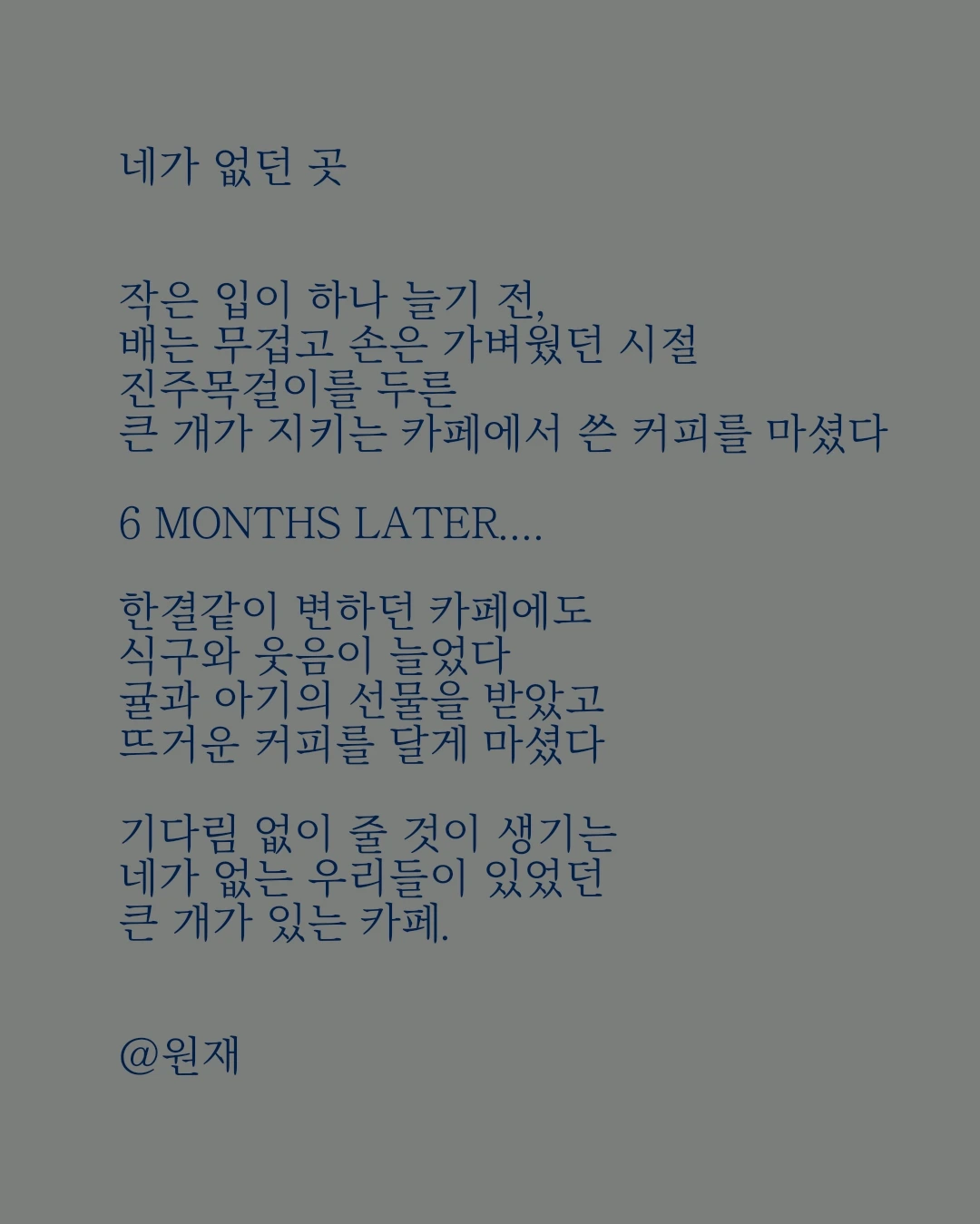 태아 검진을 위해 들리던 산부인과 근처에는 제주살이 초기부터 들리던 작은 카페가 있다. 검진이 끝나면 카페에 들르는 일이 하나의 루틴이 되었고, 우리는 그곳에서 책을 읽거나 잡담을 나누었다. 카페에는 과일 이름을 가진 하얗고 큰 개가 살고 있었는데 선택적 거리 두기를 즐기는 매력적인 친구였다. 기분이 좋은 날에는 무릎에 누워 꼬리를 요란하게 흔들었고, 센티한 날에는 손님들의 애타는 시선과 손짓을 뒤로한 채 가게 밖 풍경을 도도한 선비처럼 관조했다.
