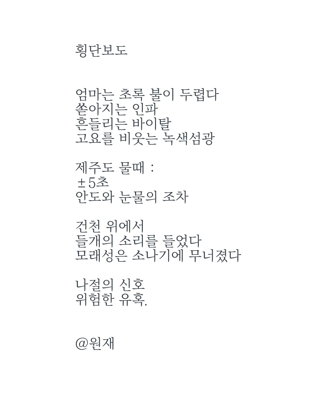 집에서 한 골목만 나가면 왕복 7차선 도로가 나오는데, 널찍한 횡단보도의 길이는 대략 25m 정도 된다. 보행자에게 주어진 시간은 대략 33초. 임산부와 노인은 무거운 몸을 이끌고 승자 없는 괴로운 레이스를 펼쳐야 한다. 우리는 항상 5초 정도를 남기거나, 5초를 초과한 채 건너편에 도달했다. 속도가 느려질 때 우리가 약자가 되어있음을, 잠시라도 뒤를 돌아볼 여유가 없는 세상에 살아왔음을 깨달았다.