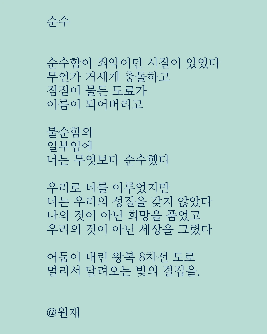 낮잠에서 깨어 몸을 뒤척이던 아기가 나와 눈이 마주치자 활짝 웃었다. 요즘은 아기의 방문을 열어보는 것이 나의 가장 큰 행복이다. 유난을 떨지 않아도 환하게 웃어주는 아기를 보고 있으면, 순수함이 품고 있던 청량한 냉기를 들이마신 것 같아 숨이 멎는듯한 기분이 든다. 아기에게서 순수를 느낄 때, 불순한 우리들의 세상이 떠올라 조금은 슬퍼진다.