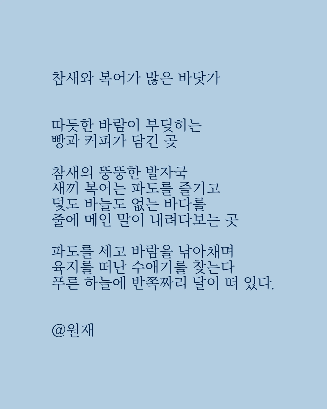 유모차에 묶인 아기는 자유로운 새와 물고기를 원껏 구경했고, 나와 아기 엄마는 빵과 커피를 마시며 꽤 오랜 시간 파도의 노래를 감상했다. 어둠이 태양을 집어삼키고 달의 표정이 더욱 명료해질 때, 우리는 아기를 안고 이곳을 떠났다. 짧았던 여행을 뒤로하고 다시 일상의 고삐를 당기러!