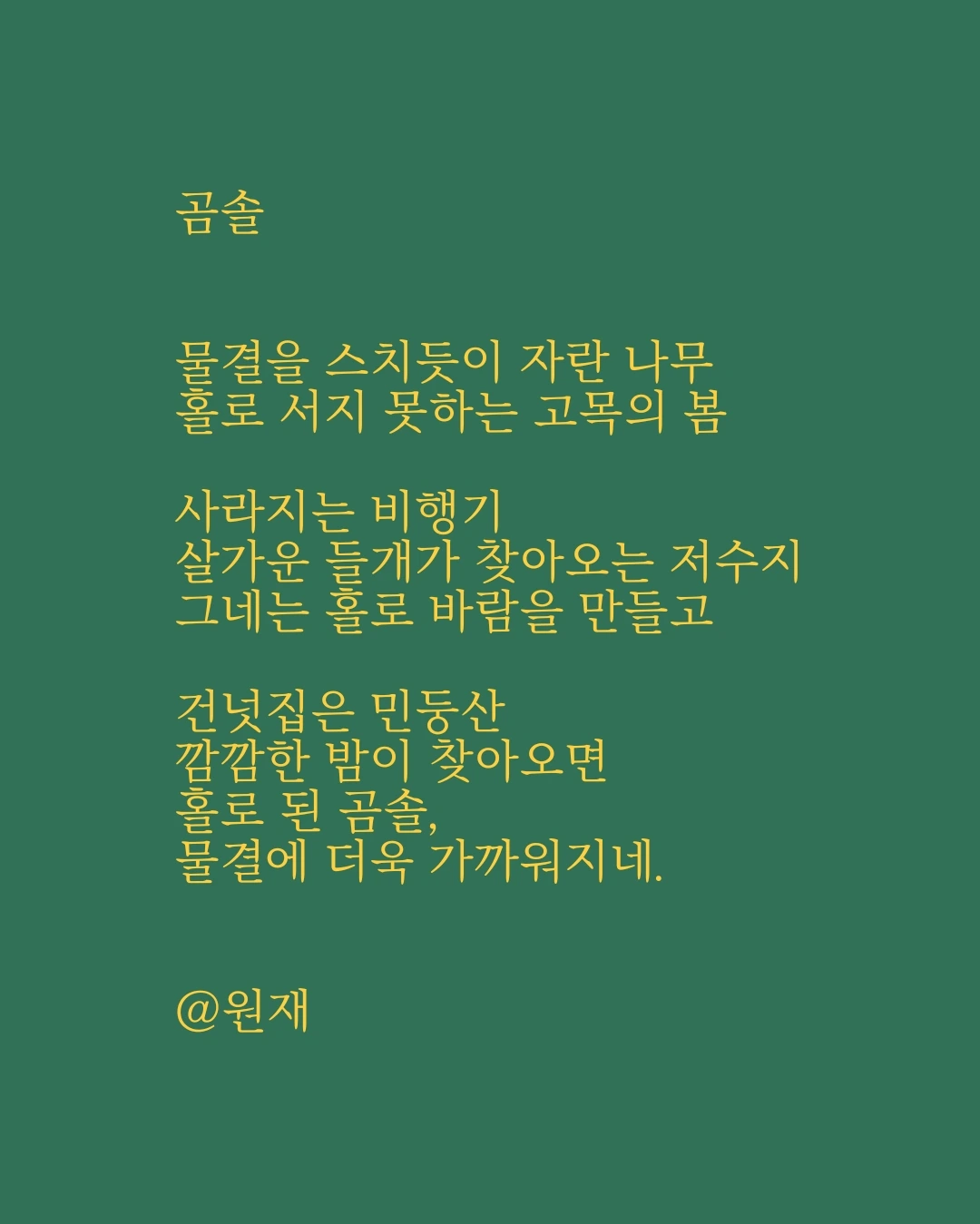 곰솔 건너편에도 우람한 몇 그루의 소나무가 있었다. 제주도를 떠나지 않는 개발의 바람은 바다와 숲을 가리지 않으며 풍경을 뒤흔들었고, 곰솔은 천연기념물이라는 이름 덕분에 거센 바람을 피해 갈 수 있었다. 이곳의 곰솔은 생명력이 강해서 살아남은 것이 아니었다. 민물로 가득한 풍요로운 땅에서 거대한 고목은 조금씩 저수지로 기울어지고, 아니 가라앉고 있었다.