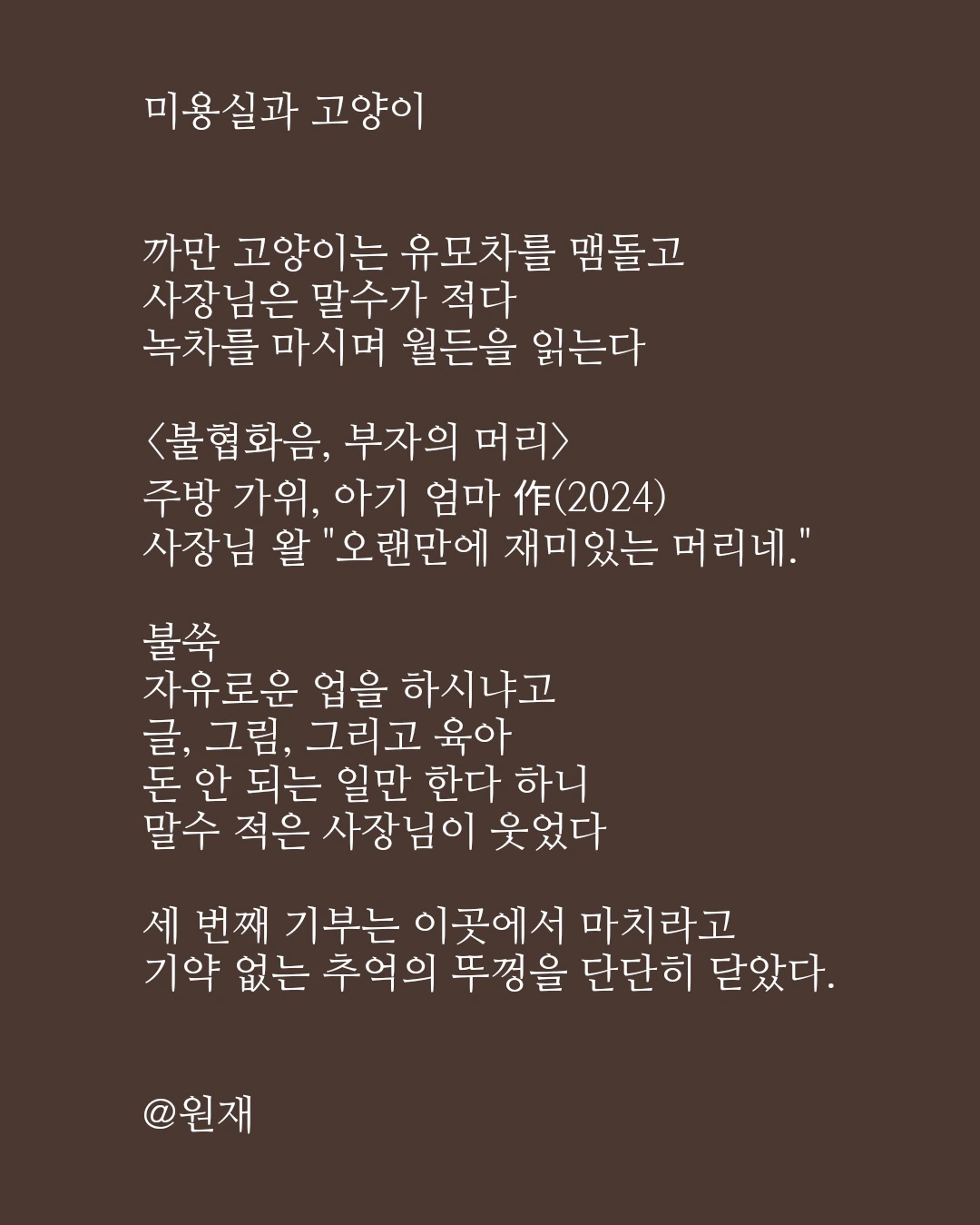 정작 까만 고양이를 보고 가장 좋아했던 사람은 아기 엄마였다. 다행스럽게도 짧은 머리에 와이드 셔츠, 수염과 문신이 인상적이었던 남자 사장님은 뜨거운 자신감과 날 선 예민함을 겸비한 실력파였다. 사장님은 내 머리가 익는 동안에 엄마 품에 안긴 아이의 삐뚤빼뚤한 앞머리를 손질해 주셨다. 아기의 앞머리 또한 작가를 숨길 수 없는(당연히 아기 엄마의 솜씨다) 훌륭한 결과물이었고, 아기는 낯을 가리거나 울지도 않고 멀뚱멀뚱 사장님만 바라보았다.
