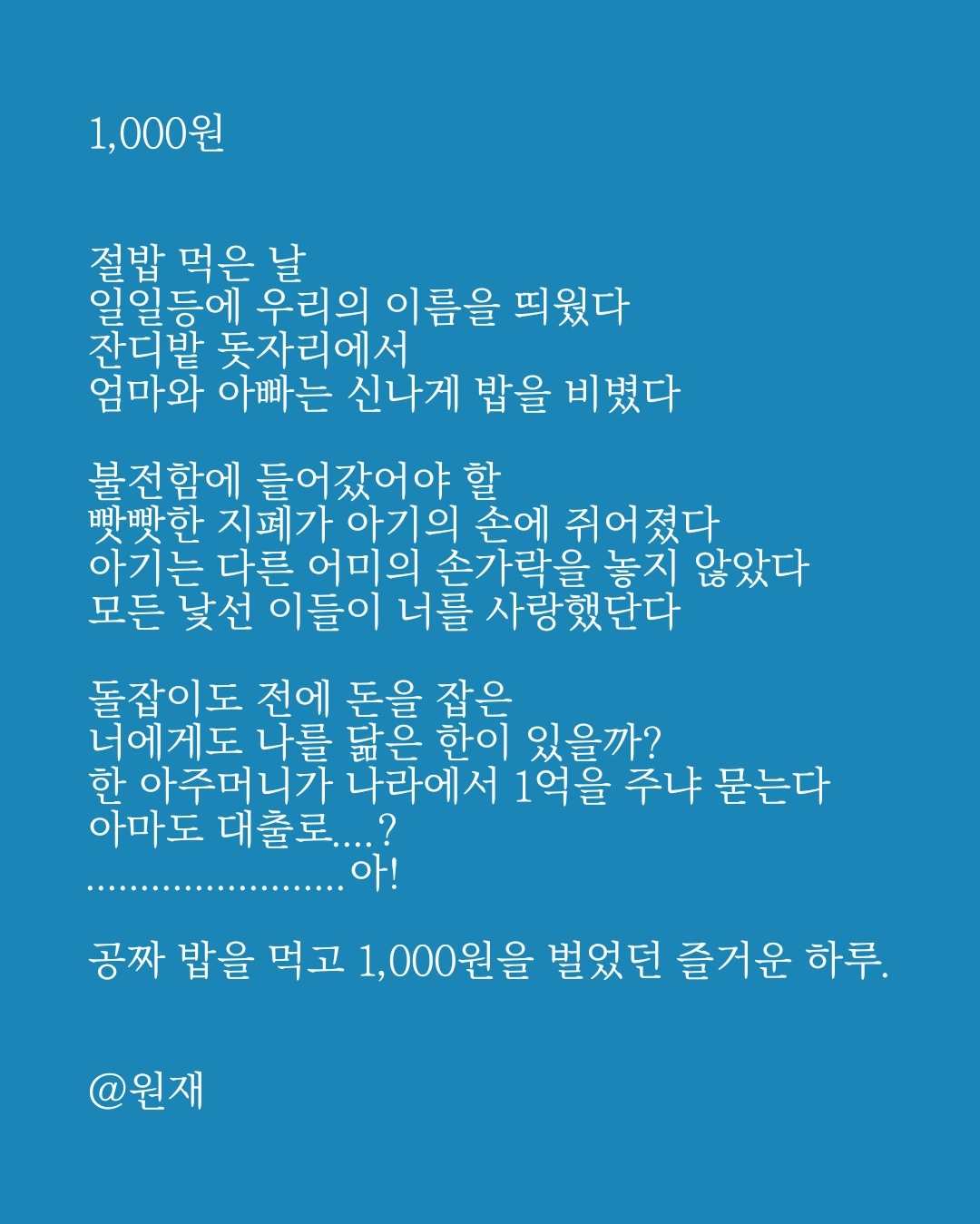 우리는 비빔밥과 미역국, 그리고 김치를 쟁반에 챙겨 그늘 아래에 자리를 잡았다. 아기는 돗자리에 대자로 누워 파닥파닥 헤엄을 쳤고, 주변 사람들은 아이를 보며 한 마디씩 덕담을 건네셨다. 아들과 딸을 데리고 우리 옆에 자리를 잡은 아주머니는 아기의 손을 꼭 잡아주셨다. 그런데 예전부터 악력이 심상치 않다 생각했던 아기가 낯선 이의 손을 놓아주지 않는 대치 사태가 발생했고(고집이 보통이 아니다) 아주머니가 가방에서 1,000원짜리 지폐를 꺼내고 나서야 상황이 종료되었다. 우리는 모두 함께 웃었다. 아기는 도대체 왜 신이 났을까?